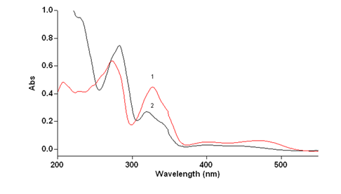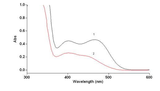 Рисунок 1.Спектр поглощения раствора СО сангвиритрина (1) и извлечения из травы маклейи (2) в спирте 70%, подкисленном серной кислотой
