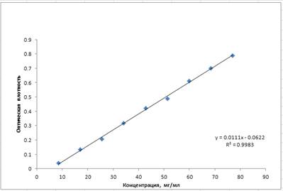 Зависимость оптической плотности от концентрации СО сангвиритрина прямо пропорциональна в диапазоне концентраций 8,5 – 77 мкг/мл, коэффициент корреляции близок к единице (0,9983), что служит критерием для подтверждения линейности.